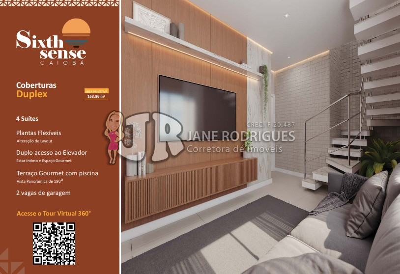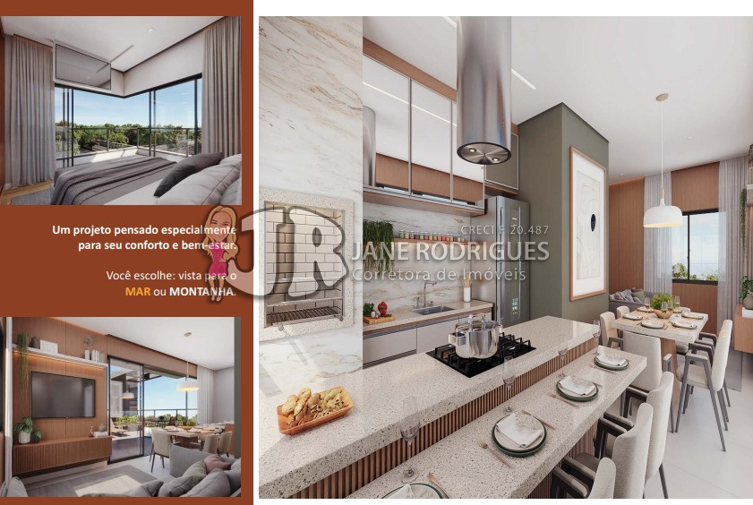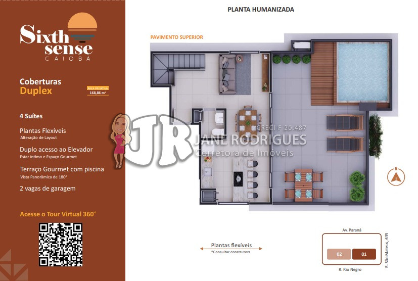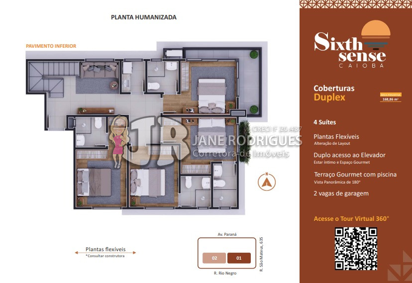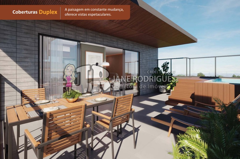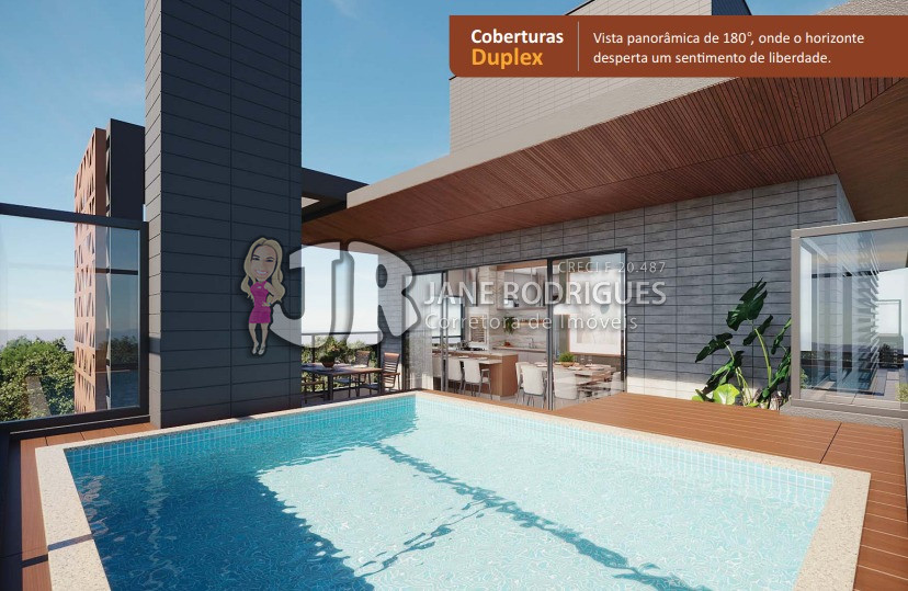 Cobertura Duplex 602 – Área privativa de 122,64m², contendo 4 suítes, duplo acesso ao elevador, sala integrada à cozinha, banheiro social, área de serviço, amplo terraço gourmet com vista panorâmica de 180°, churrasqueira e piscina. Duas vagas de garagem. Valor: a partir de R$ 1.899.000,00