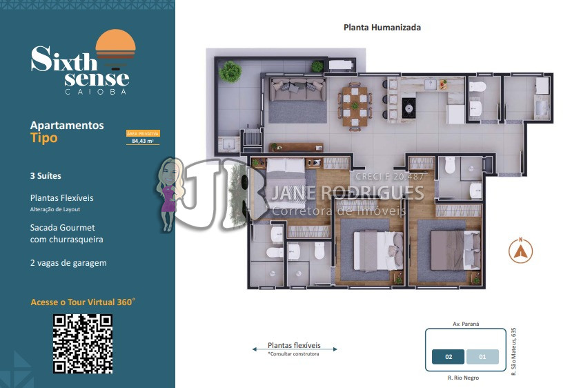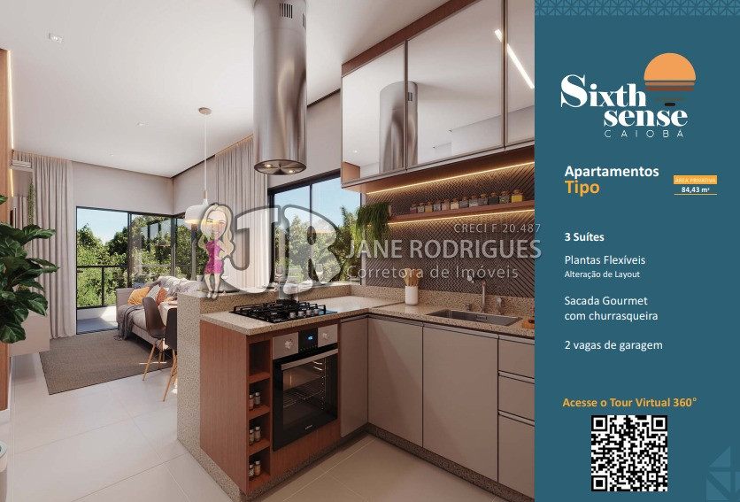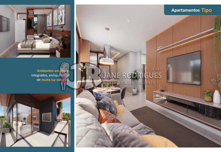 Apartamento Tipo 301– Área privativa de 84,43m², contendo 3 suítes, sala integrada à cozinha, banheiro social, área de serviço, sacada com churrasqueira. Duas vagas de garagem. Valor: a partir de R$ 859.000,00