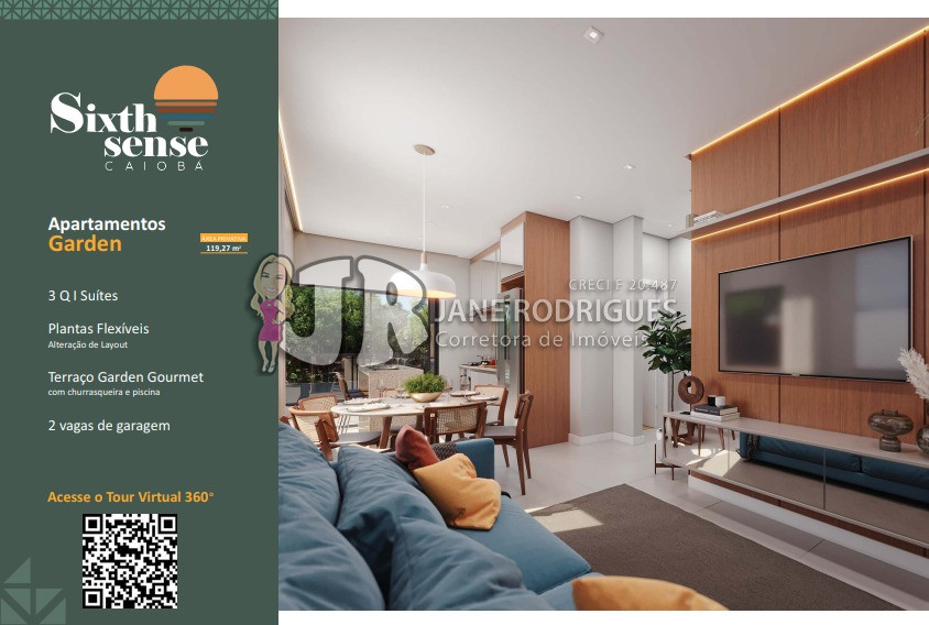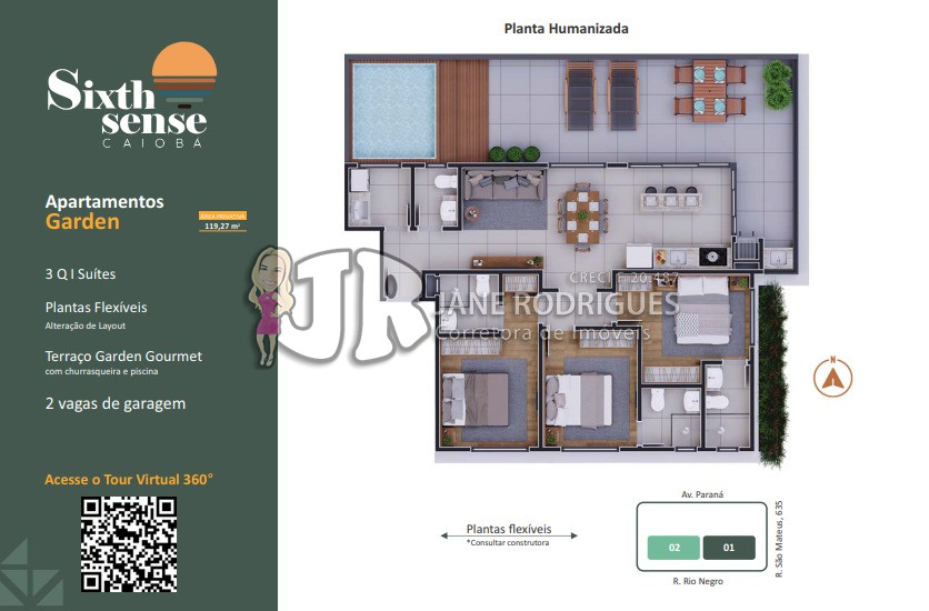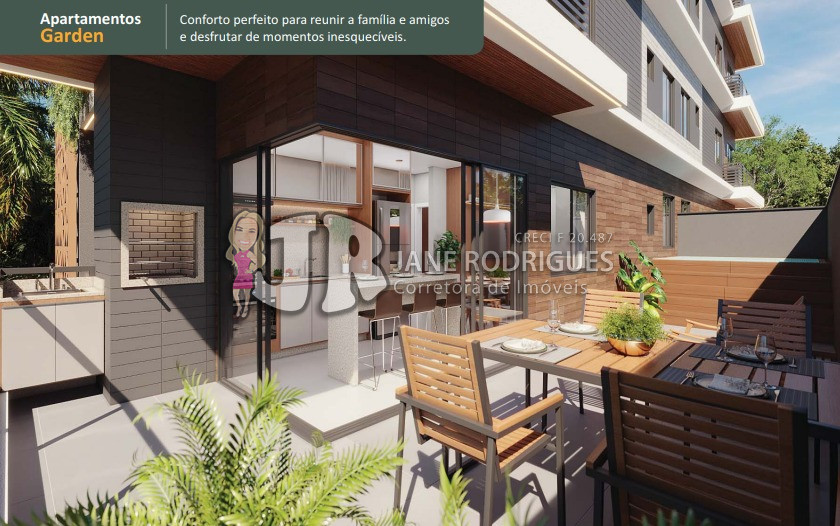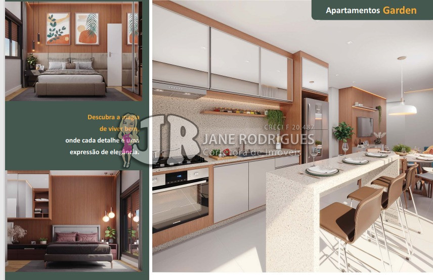 Garden 201 – Área privativa de 119,27m², contendo 3 suítes, sala integrada à cozinha, banheiro social, área de serviço, amplo terraço gourmet com churrasqueira e piscina. Duas vagas de garagem. Valor: a partir de R$ 1.399.000,00
