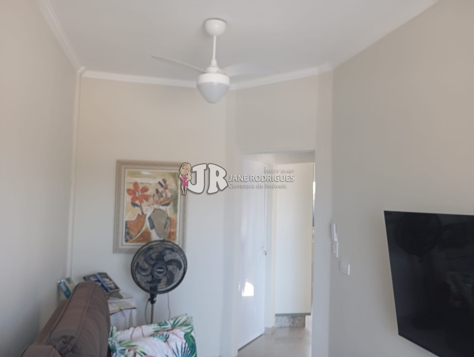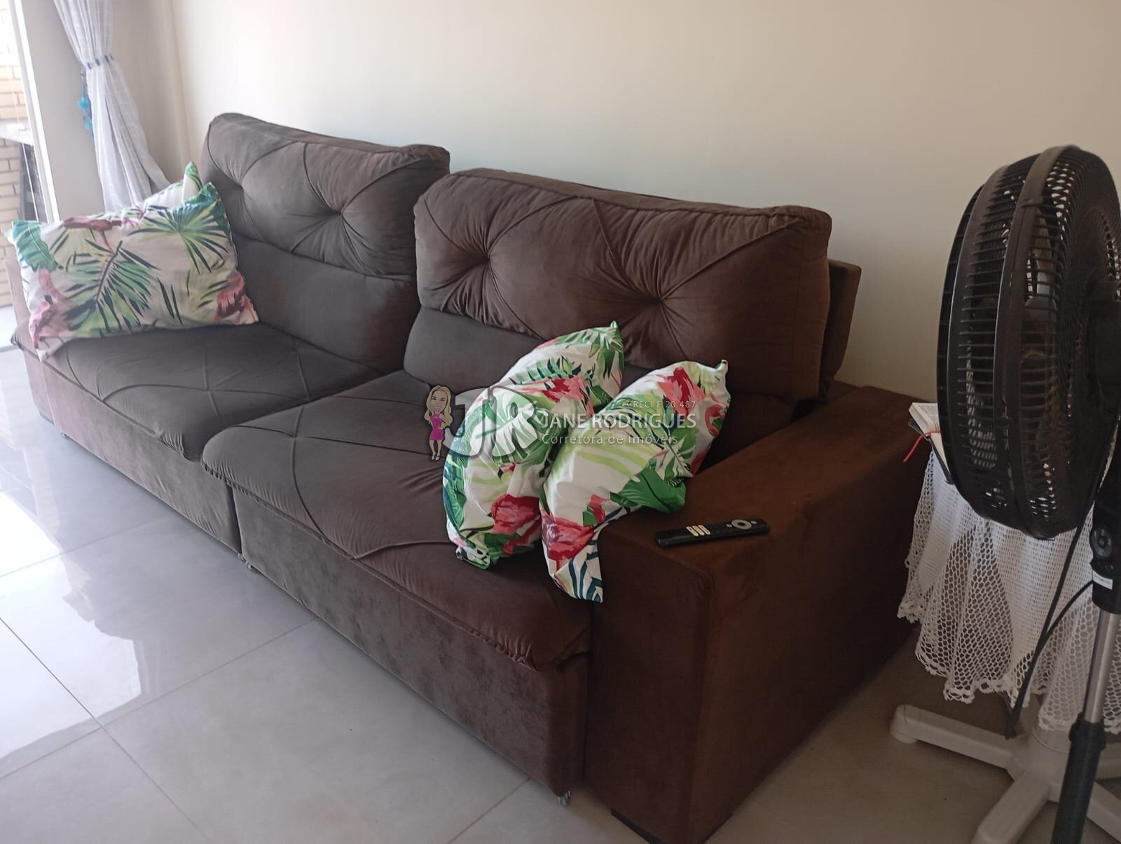 Sala espaçosa com sofá grande, cama auxiliar, TV e ventilador de teto com controle